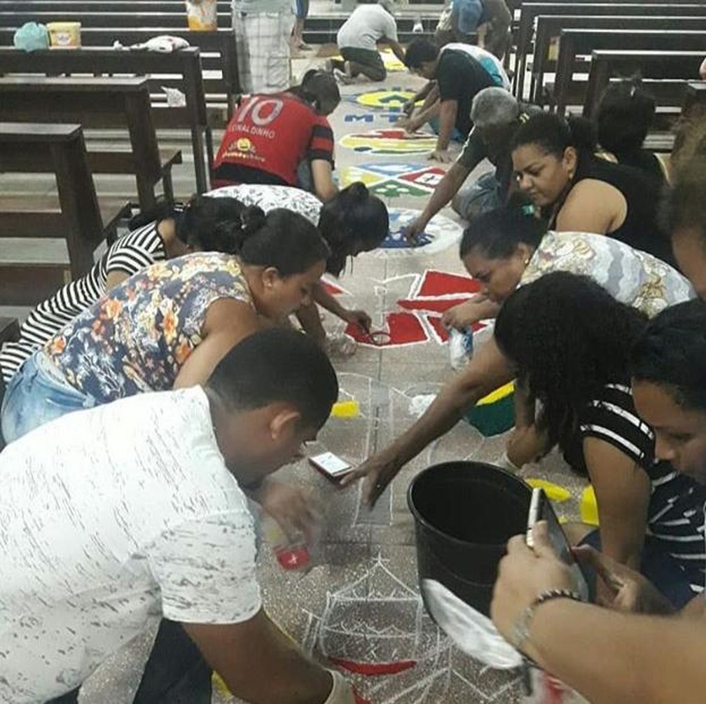 Muitos católicos se reuniram na paróquia do bairro Guarapes, na Zona Oeste de Natal, para a confecção dos tapetes de Corpus Christi — Foto: Redes Sociais