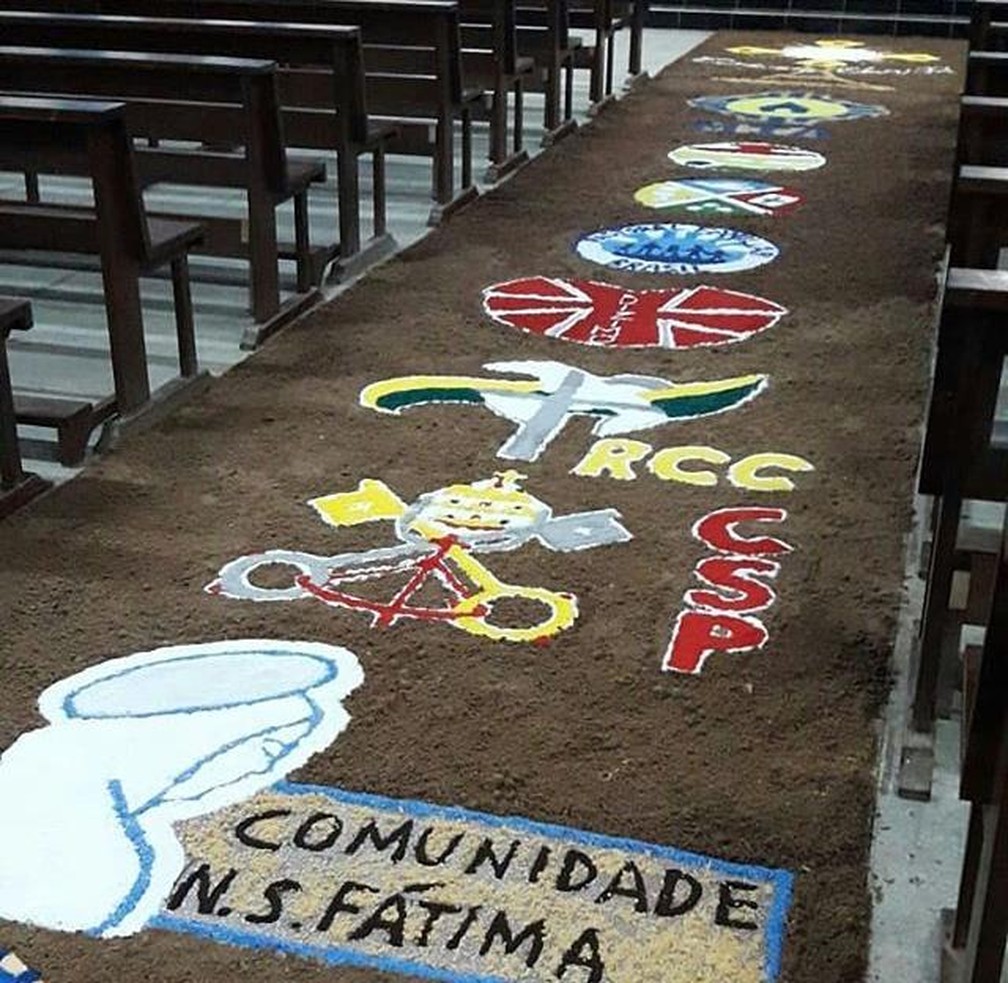 A tradição católica recria desenhos com mensagens cristãs e marca o caminho percorrido pelas procissões.